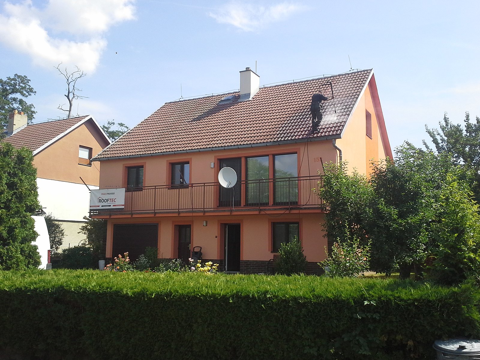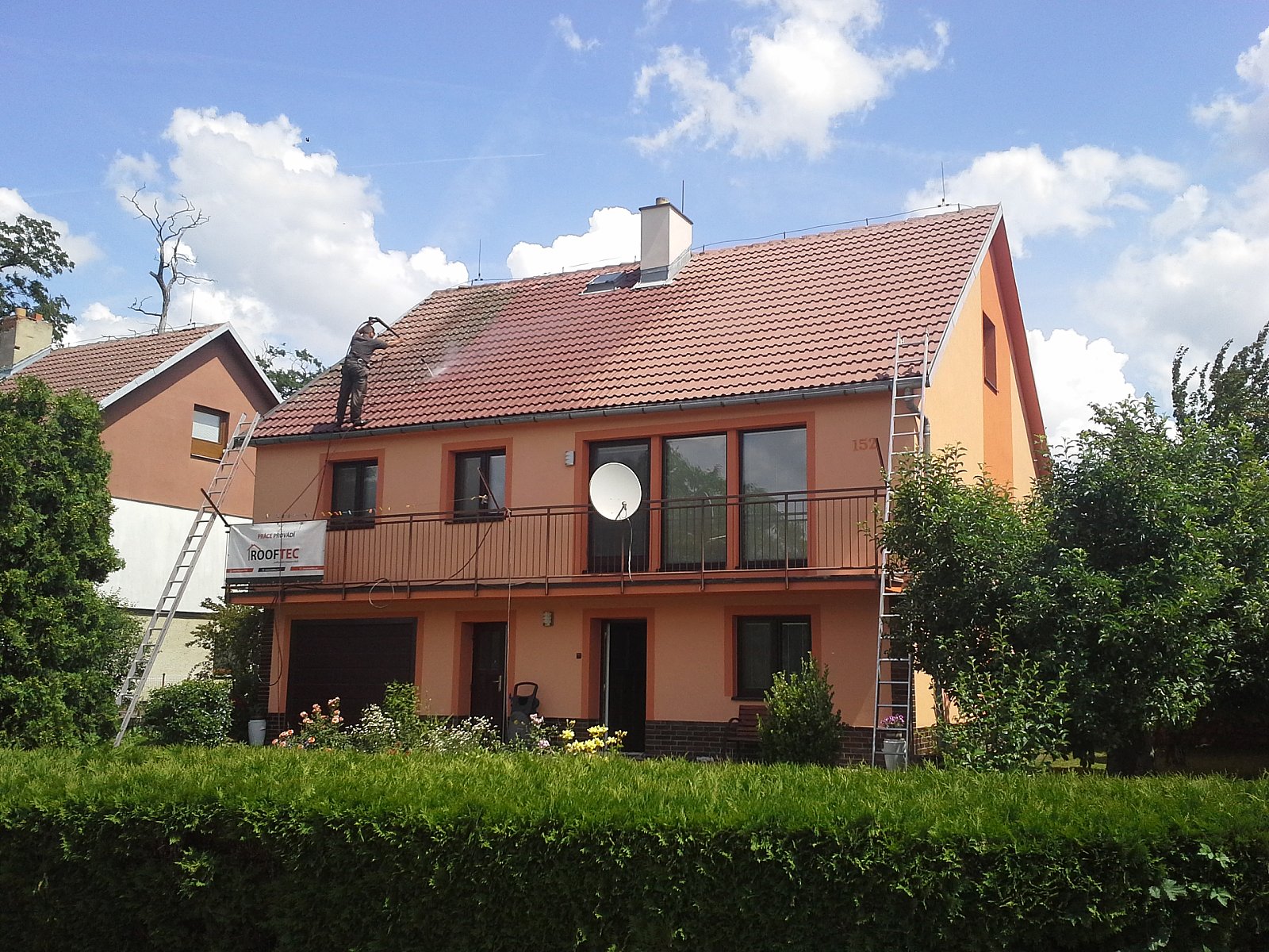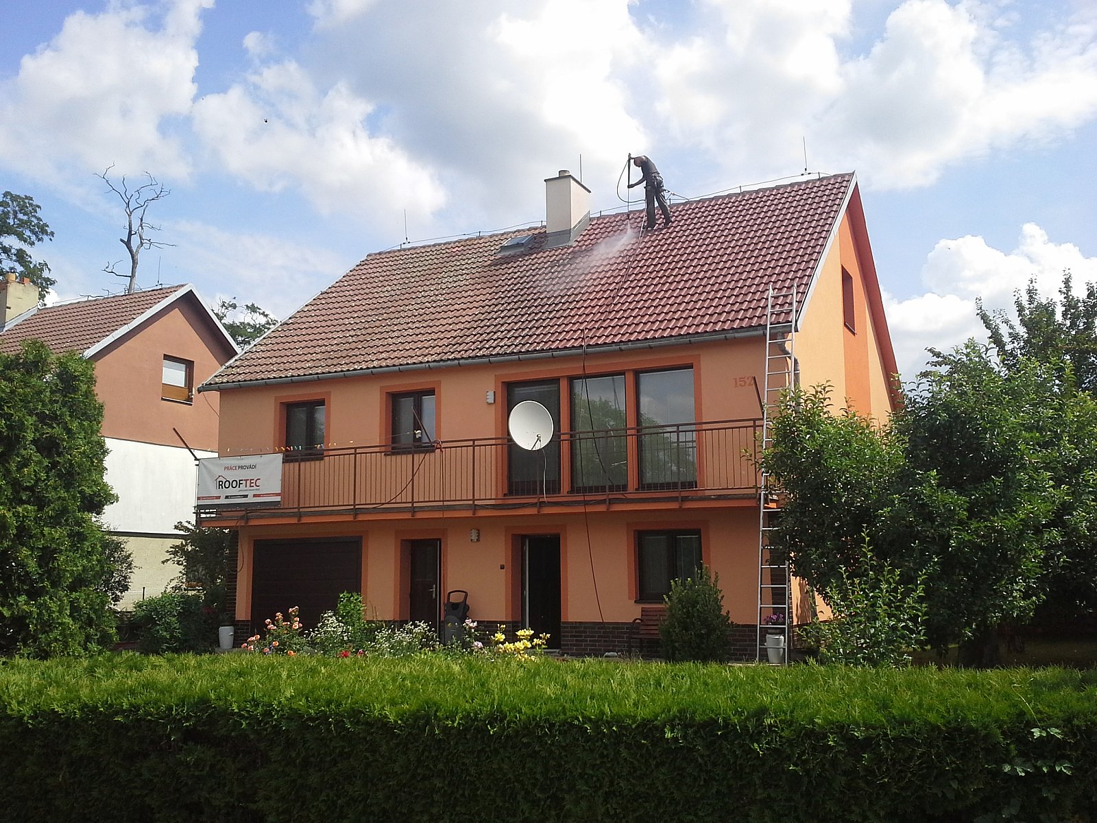 Čištění střechy rodinného domu od biologického napadení za pomocí chemického přípavku a vysokotlakého čističe.