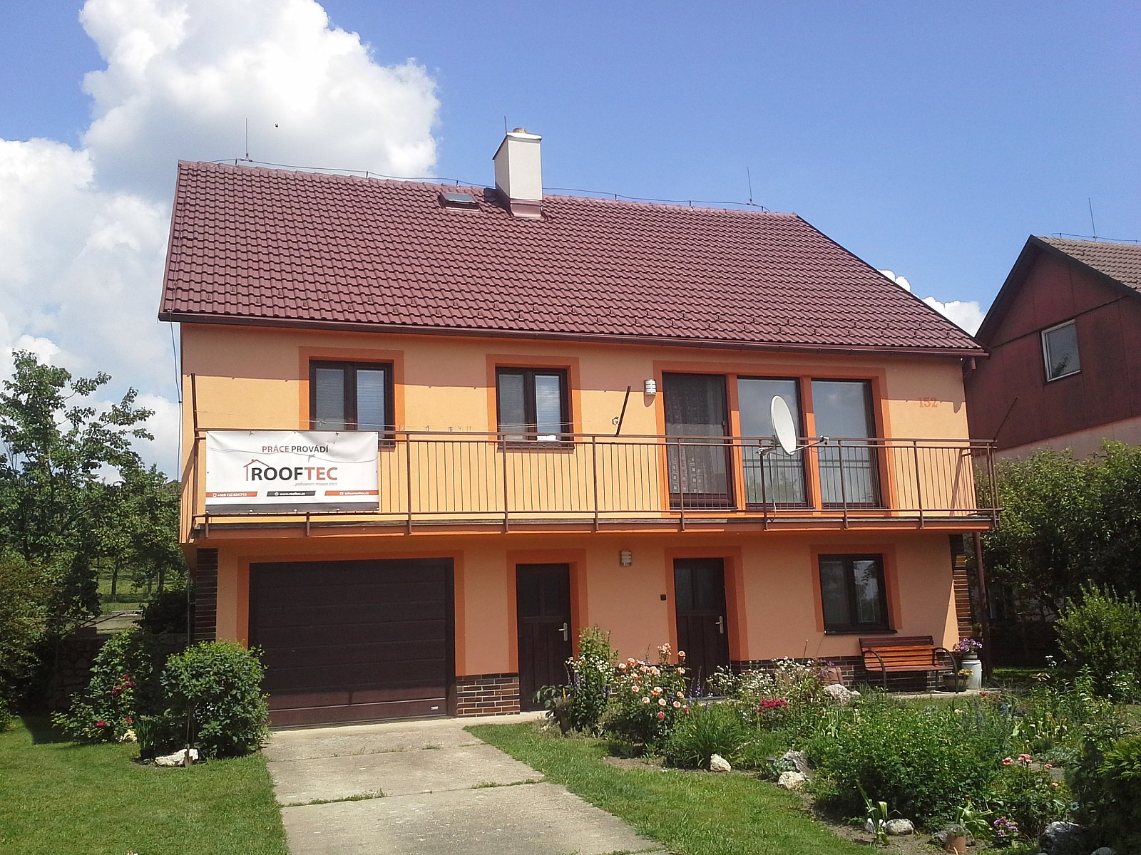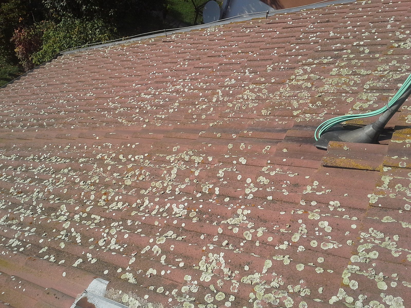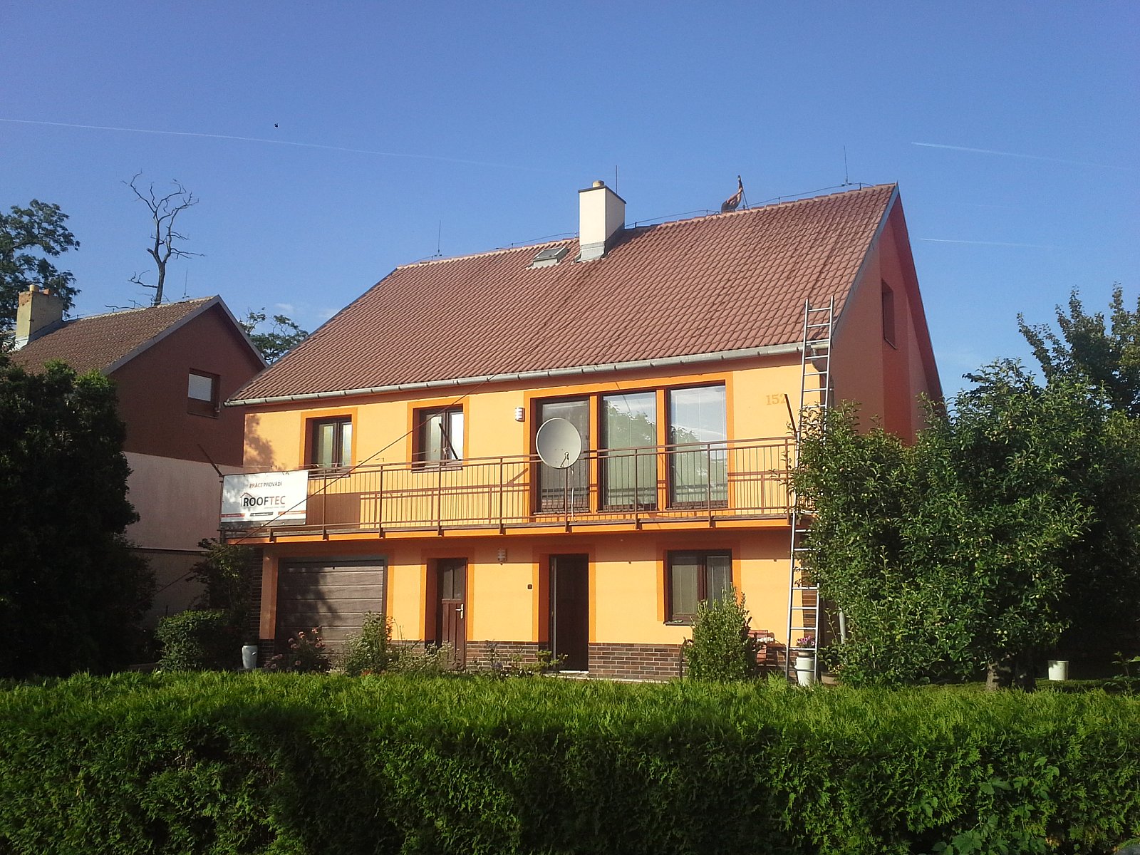 Čištění střechy rodinného domu od biologického napadení za pomocí chemického přípavku a vysokotlakého čističe.